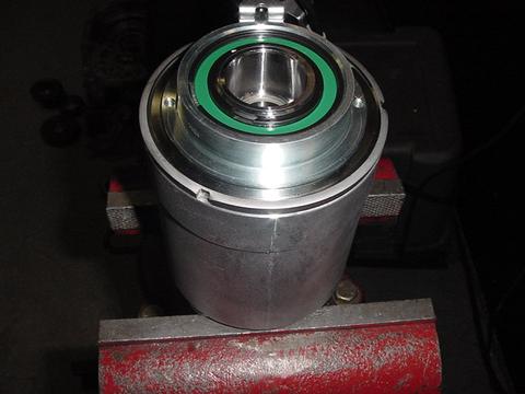 Set the unit up on a vise as shown in the picture below. Note, you want the vise to hold it at the bolt heads and not the body of the housing. The housing can be easily damaged if pressure is applied, so don't put pressure on the housing, only the bolts.